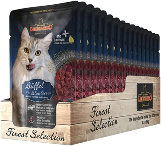 LEONARDO® Finest Selection Buste [16x85g Bufalo + Mirtilli] | Cibo umido senza cereali per gatti adulti