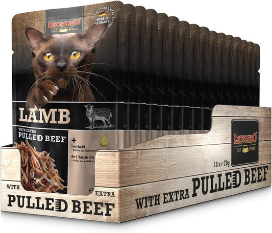 LEONARDO® Extra Pulled Beef - [16x70g Agnello con straccetti di carne di manzo] Pulled Beef | Cibo umido senza cereali per gatti adulti