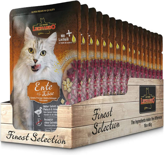 LEONARDO® Finest Selection Buste [16x85g Anatra + Formaggio] | Cibo umido senza cereali per gatti | Alimento completo umido in busta monoporzione Anatra + formaggio. 16x85g