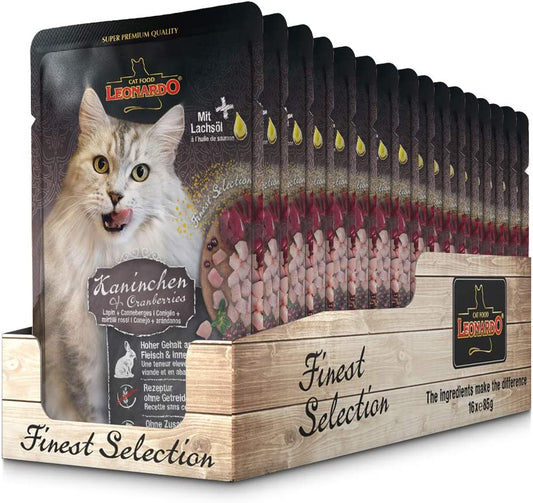 LEONARDO® Finest Selection Buste [16x85g Coniglio + Cranberries] | Cibo umido senza cereali per gatti Adulti