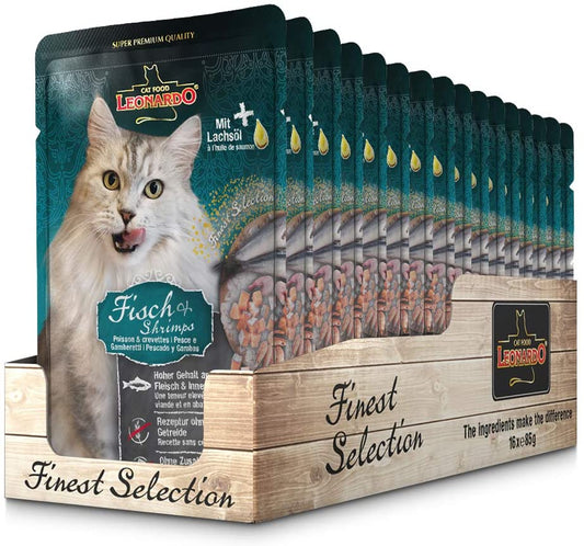 LEONARDO® Finest Selection Buste [16x85g Pesce + Gamberetti] | Cibo umido senza cereali per gatti adulti