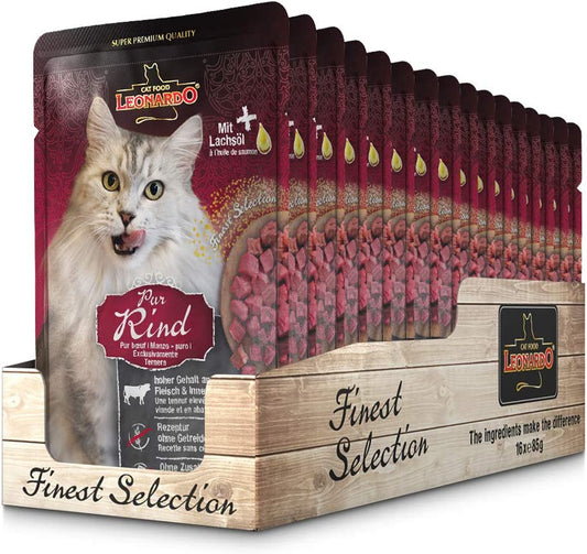 LEONARDO® Finest Selection Buste [16x85g Manzo - puro] | Cibo umido senza cereali per gatti Adulti