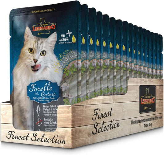 LEONARDO® Finest Selection Buste [16x85g Trota + Catnip] | Cibo umido senza cereali per gatti adulti